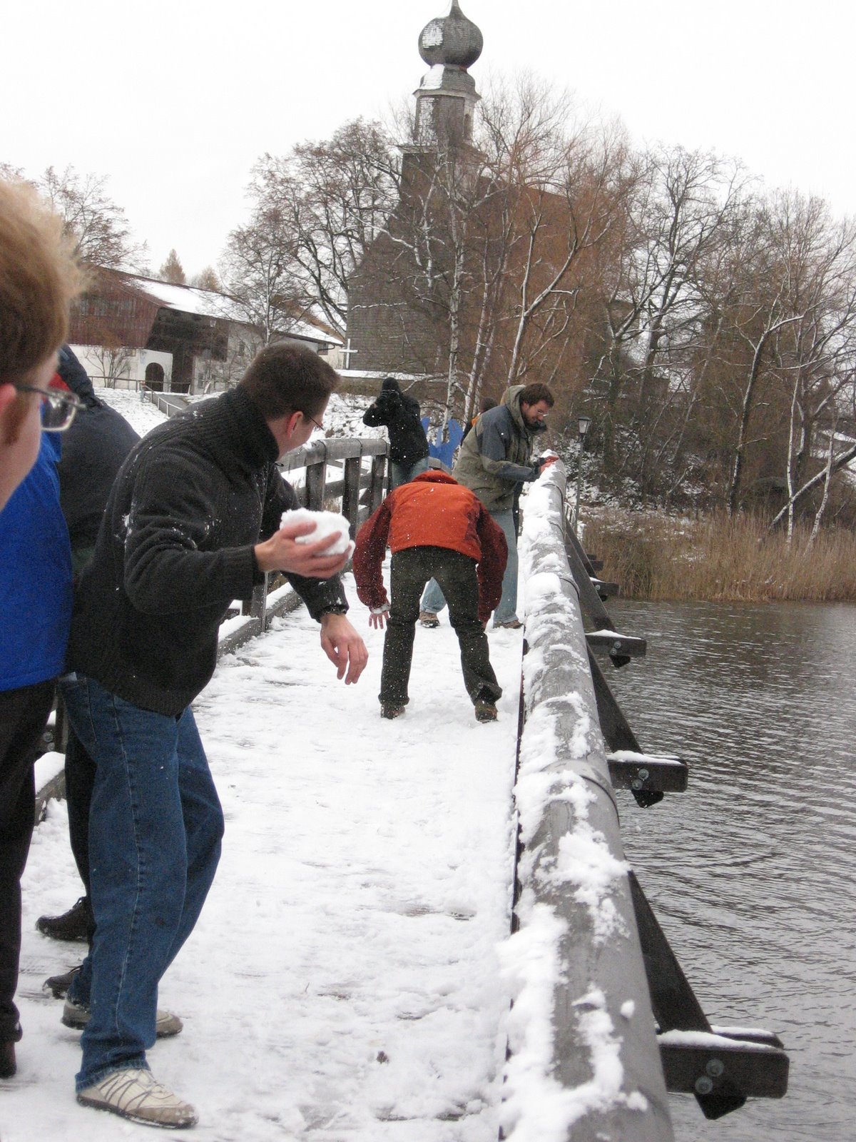 翌日午飯後,跟同事散步,下了兩天雪後,到處積雪都不少,正好來一場雪球大戰!戰場由出發點,蔓延至修道院毗鄰的湖中那道橋,再伸延到橋後的小山,湊巧山上有座教堂,好些人便躲到環繞教堂的圍牆後,居高臨下狙擊!雪戰為時雖短,但大家都玩得盡興,一來積雪夠多,「彈藥」取之不盡,而且隨時隨地開戰都可,二來在郊外不用像市區般多顧忌,擔心誤中他人。